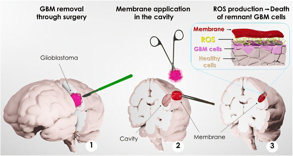 Our work introduces for the first time the use of novel bioinspired membranes designed as a potential patch platform for localized intervention in glioblastoma after surgery, representing a promising advancement in this field. Despite the rapid growth in mussel-inspired research, this work is distinctly innovative. Unlike the common hydrogel and coatings focus, our solid, free-standing bioadhesive membranes could offer a unique solution for glioblastoma treatment. Moreover, their selective toxicity against cancer cells, while sparing healthy astrocytes in vitro, highlights their potential for a novel and targeted application. Our bioinspired membrane addresses critical challenges such as adhesion in humid environments, infection prevention, and biocompatibility. The adhesive properties of the membrane ensure it stays in place, allowing for the sustained delivery of the localized cytotoxic effect to the affected area. This novel approach offers a localized and sustained therapeutic concept based on ROS modulation, that could complement the current glioblastoma treatment paradigm.
